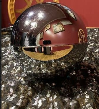 A glittery large ball floats in all directions without any visible means or support. It floats in front of a semi transparent cloth. The ball floats upwards and downwards, from one side to the other side of the cloth, making a very uncanny effect upon the spectators.