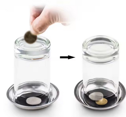 Two coins are seen on a drink coaster. Let's say a quarter and a penny. One coin is selected by your spectator and removed from the tray. A cup or glass is inverted over the coin in the tray. The other coin is visibly pushed through the base of the cup to join the other coin. All may be examined. Easy to do. Use your own coins and glass.