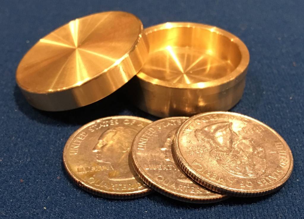 The famed Okito Coin Box for US Quarters. This box holds 3 quarters.