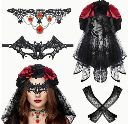 The Day of the Dead Female Kit has great accessories to complete your costume. Included is a black and red rose headband with black lace with spider web pattern, black elbow length finger-less black lace gloves with spider web pattern, black lace bat eye mask, black choker with faux red jewels.