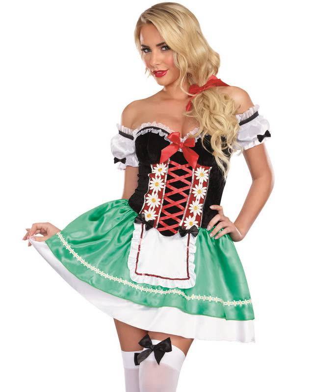 This cute and sexy Bavarian dress is great choice for a German Beer girl for Oktoberfest! Great costume for a Swiss Miss on Halloween or Fancy Dress. One piece dress has under wire foam cups and attached apron. Dress is adorned with daisies, ribbons and bows.