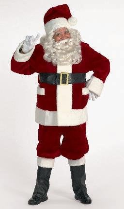 Pile plus Santa suit is a rich burgundy color with deluxe white plush trim. The jacket is partially lined. The coat has a zipper, belt loops and deep satin lined pockets. The outside pockets are a rare feature on most suits, even the very high end suits. The pants have an elastic waist and have side pockets. The hat has a large pom pom. The belt is bound with a loop and buckle with gilt and prong. The deluxe vinyl boot tops have deluxe white pile plush cuffs on the top. Wear any black show with them. Supplied with knitted white gloves.