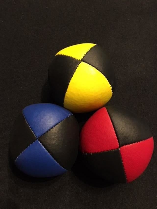Set of three professional juggling bean bags. Each ultra leather ball weighs 120 grams and is filled with bird seed millet.