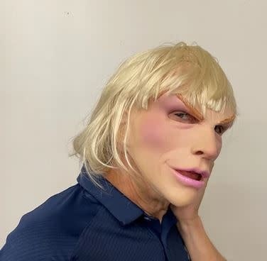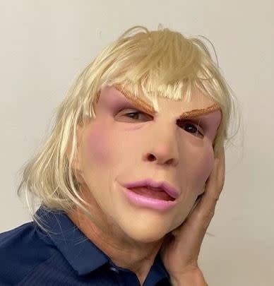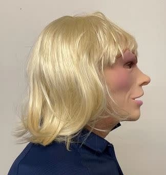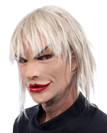 This nasty lady has an attitude, this snug fitting super soft mask achieves mouth movement in a smooth skinned design. The blond wig results in a look of uncertainty, is she a he or he a she. Either way she is a blast, go ahead flirt and have fun. Natural latex mask, monoacrylic wig. Hand poured, painted and assembled in the US. Natural latex compound mask integral synthetic wig. Hand poured, painted and assembled in the US. Copyright BYBY.