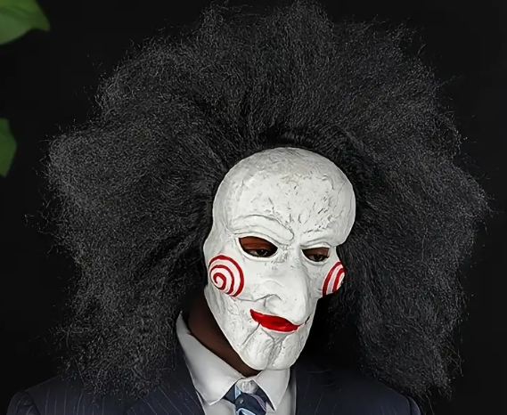 You are the puppet master so never let a puppet get the best of you. White/Grey "clown" mask with reg circular cheeks and black bushy hair.