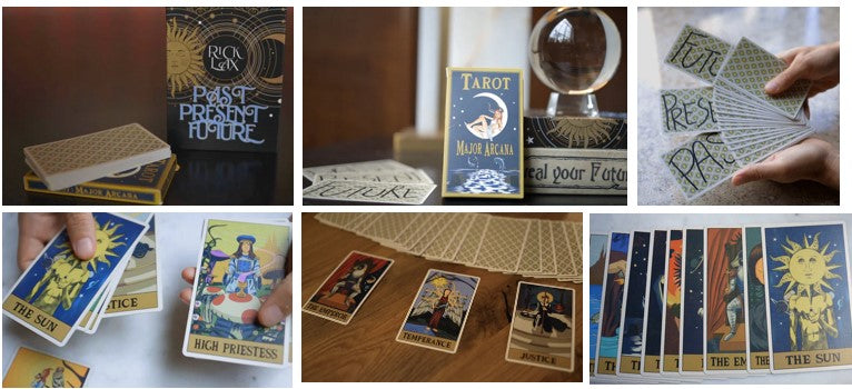 The performer introduces the Major Arcana from a deck of tarot cards and shows that on three of the cards, a single word is written. One card reads Past, another Present, and the third reads future. The cards are given a mix, and then the faces are shown, while the performer describes that the cards all represent something important in a person’s life. The performer asks the spectator to choose one card to represent their past, another to represent their present, and the last card to represent their future. The audience can freely name any card they wish. Those cards are clearly laid out on the table, and the performer gives the audience a short tarot reading before turning the selected cards over to reveal that the audience mysteriously managed to perfectly select the cards with the words, Past, Present, and Future written on the backs of the cards they selected for their reading.