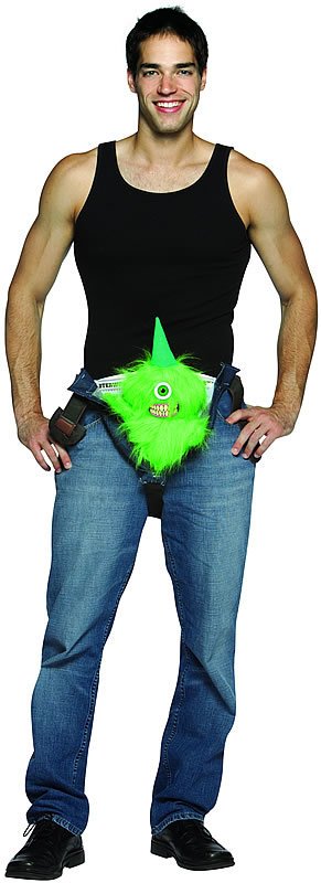 The Get Waisted! Line by Rasta Imposta® is a line of easy to wear belt harnesses. Each with an adult college humor theme. Inexpensive, light weight, easy to wear and hysterical. These are some of the most fun “non” costumes you can wear to a costume party. Wear a Get Waisted! codpiece and you will really be the life of the party! One Eyed Monster is a denim jean waist harness, unsnapped and unzipped with attached fake tighty whiteies (band says Monster Wear Brand). Emerging from your crotch area is a plush green alien creature. Monster has one-eye, one horn and teeth in a big grin . Men’s fits up to waist 40”
