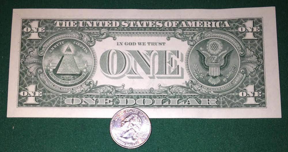 A dollar bill is shown freely on both sides. It is folded in half and then folded once more. You drop a borrowed quarter into the folded bill, unfold it and the coin has vanished. Fold it once again and dump the quarter from within the folds of the bill!