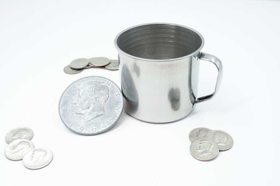 Then comes the grand finale. You tip the cup, ready to reveal the mountain of coins you’ve conjured—but instead, only one massive 3” Jumbo Half Dollar tumbles out. The cup is empty. The mystery is complete. The illusion is flawless.