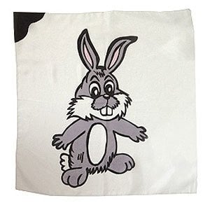 100% Fine imported Italian Silk scarf measures 36 inches from corner to corner. White silk with printed grey bunny has corner dyed black. This silk handkerchief is great for a production from a top hat or any production item. Use it in a Rabbit Wringer. Great for crowds of chilren and adults.